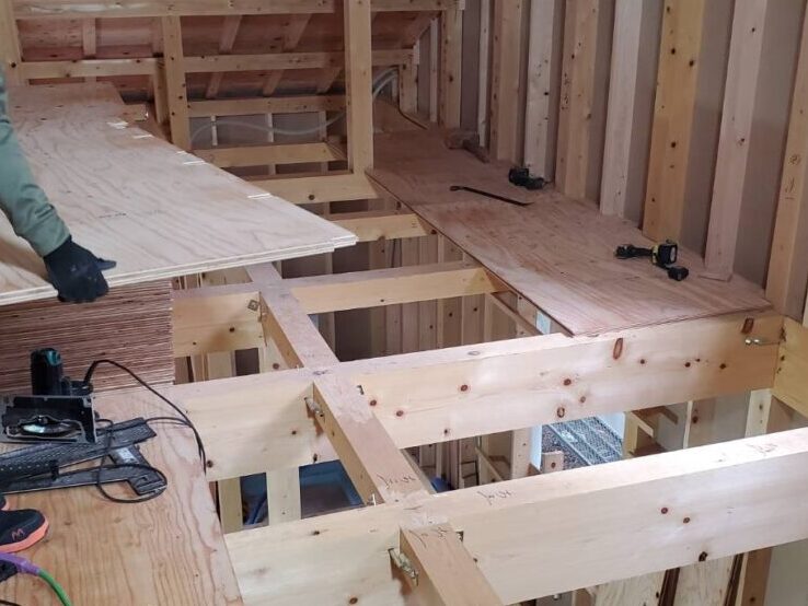 床下地には、しっかりとした構造材の上に厚みのある合板を丁寧に施工。
