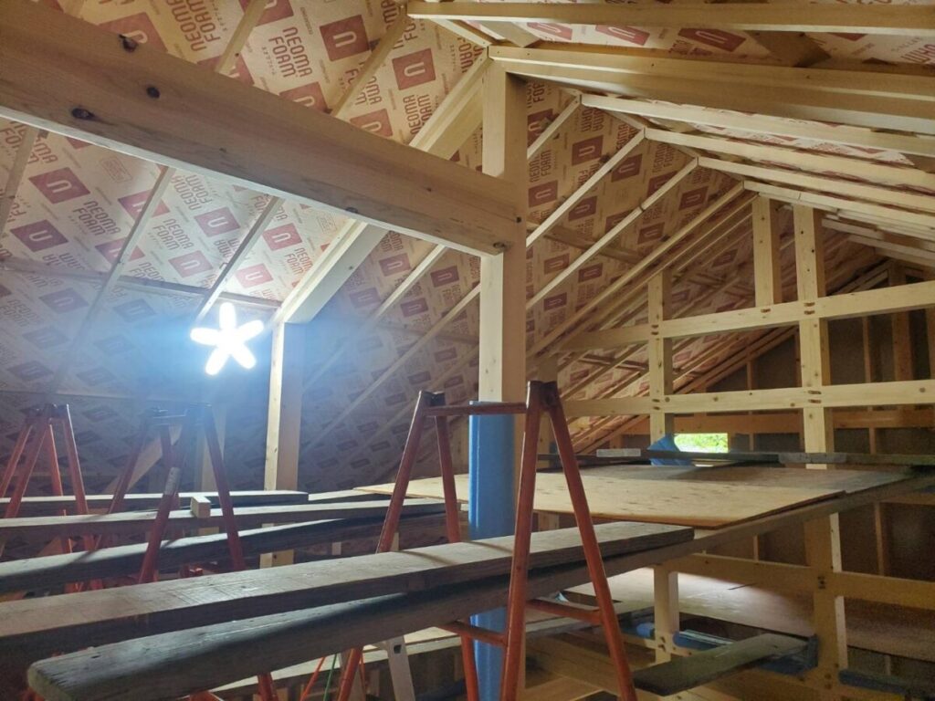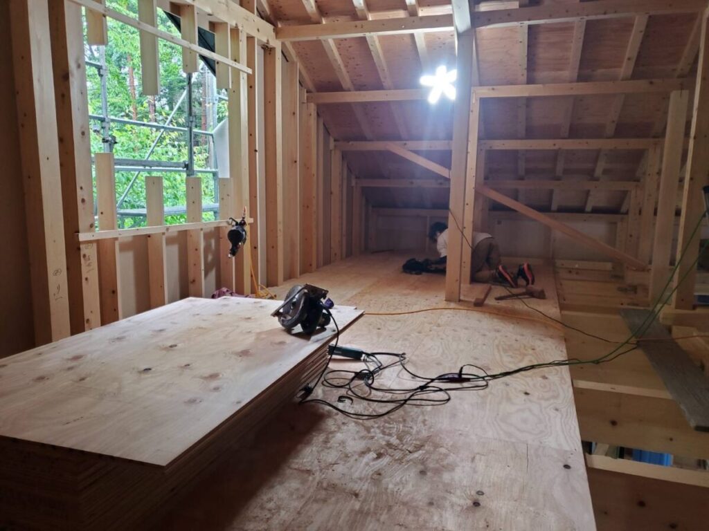 2階部分では、床下地の施工と天井断熱工事が進みました。
