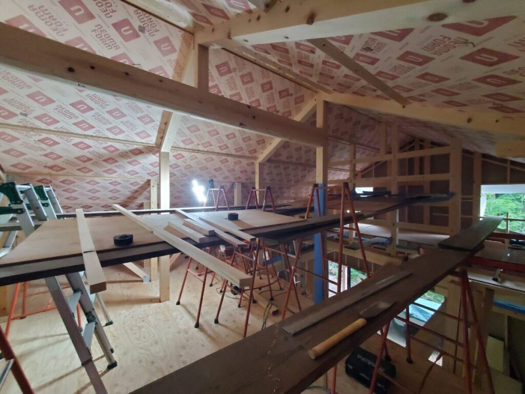 この住まいでは天井を無垢板張り仕上げとするため、断熱材の上から野縁(のぶち)を組み、板張りの下地を整えています。