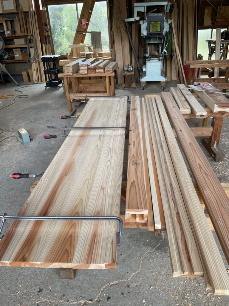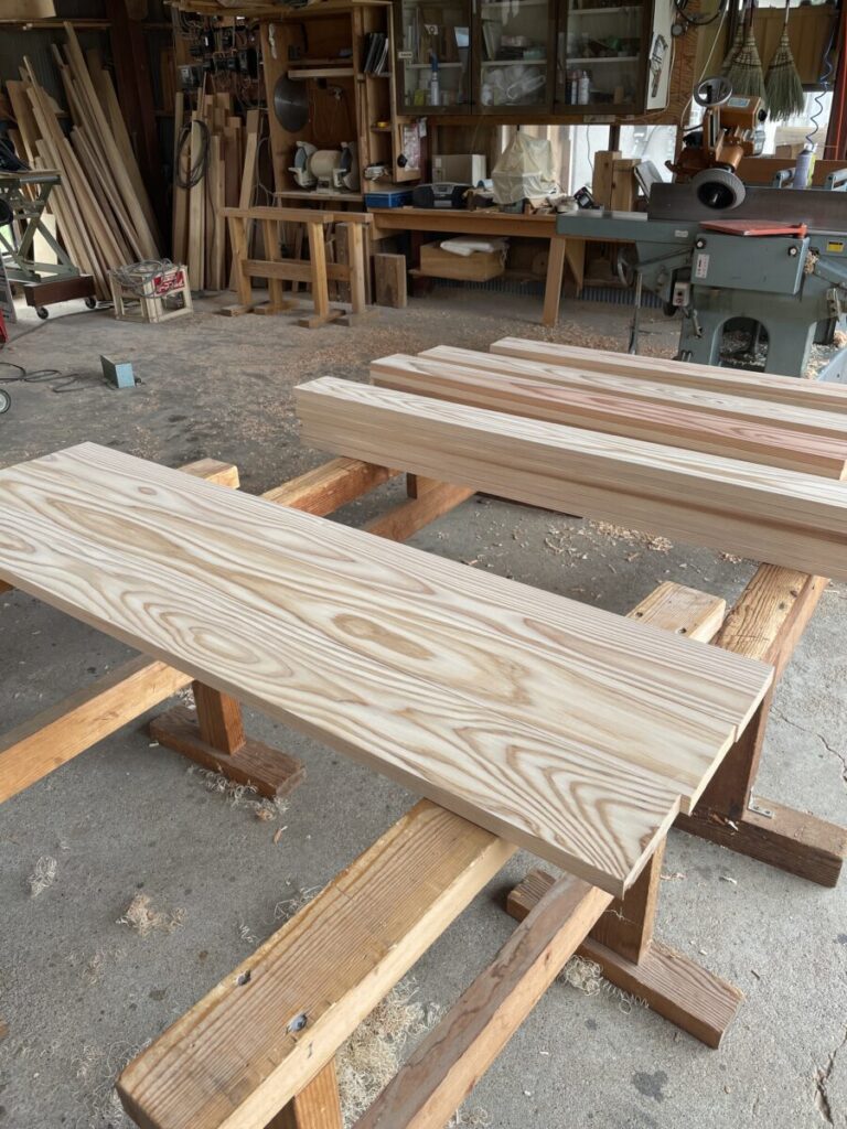 現場と並行して、工場ではキッチン収納や玄関収納に使う無垢の棚板を加工します。