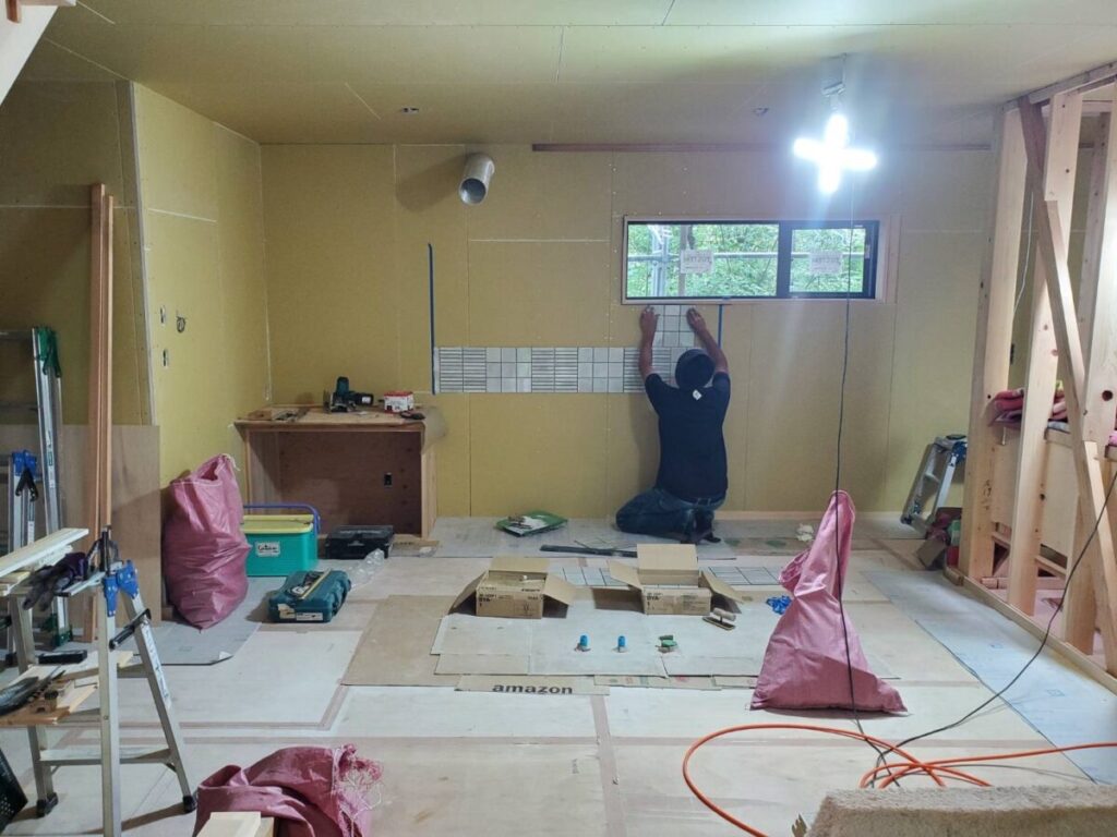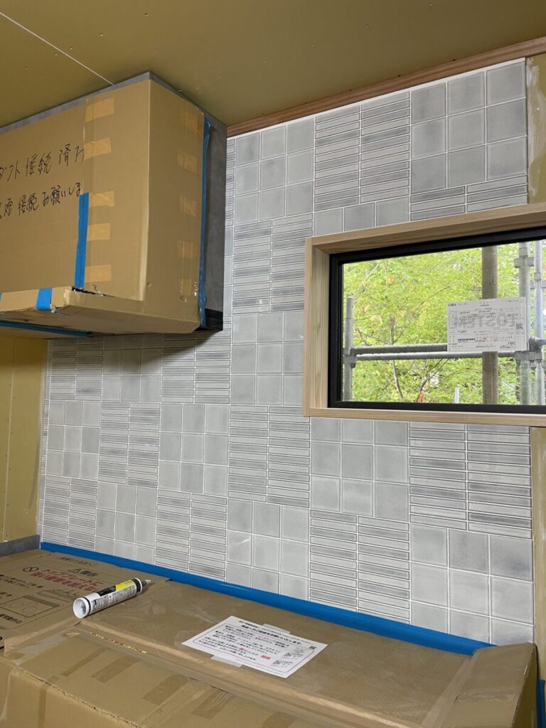 キッチン背面には、二種類の柄のタイルを一枚一枚交互に貼るデザインに。いつも一緒に仕事をしている左官職人が担当し、目地幅や貼り方のラインが美しく見えるよう、細かな調整を重ねながら施工しました。