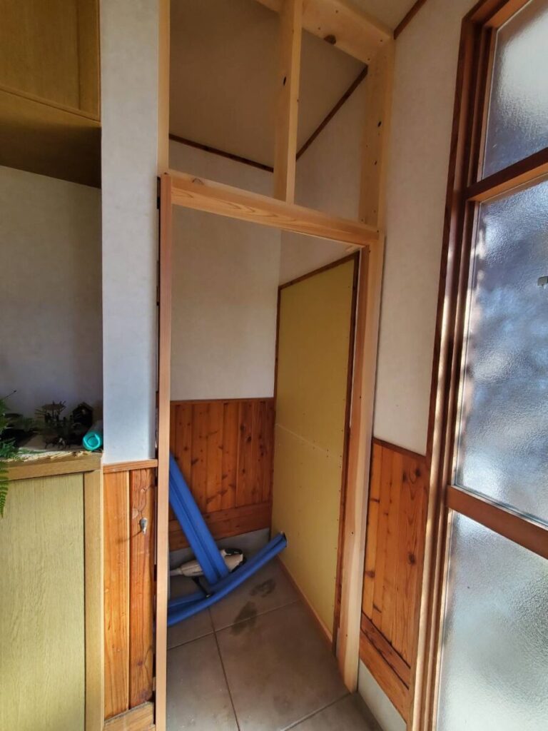 リビングの続きにある囲炉裏を撤去し、床にしたい(前回ブログにてご紹介)- 囲炉裏横から玄関へ続く建具を塞ぎたい