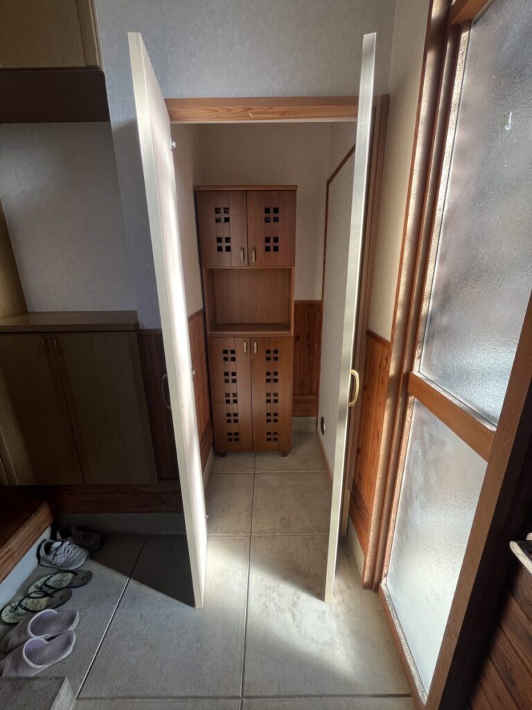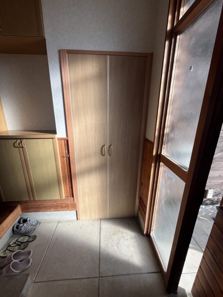 役目を終えていた玄関へ続く建具を塞ぎ、そのスペースを玄関収納として活用。