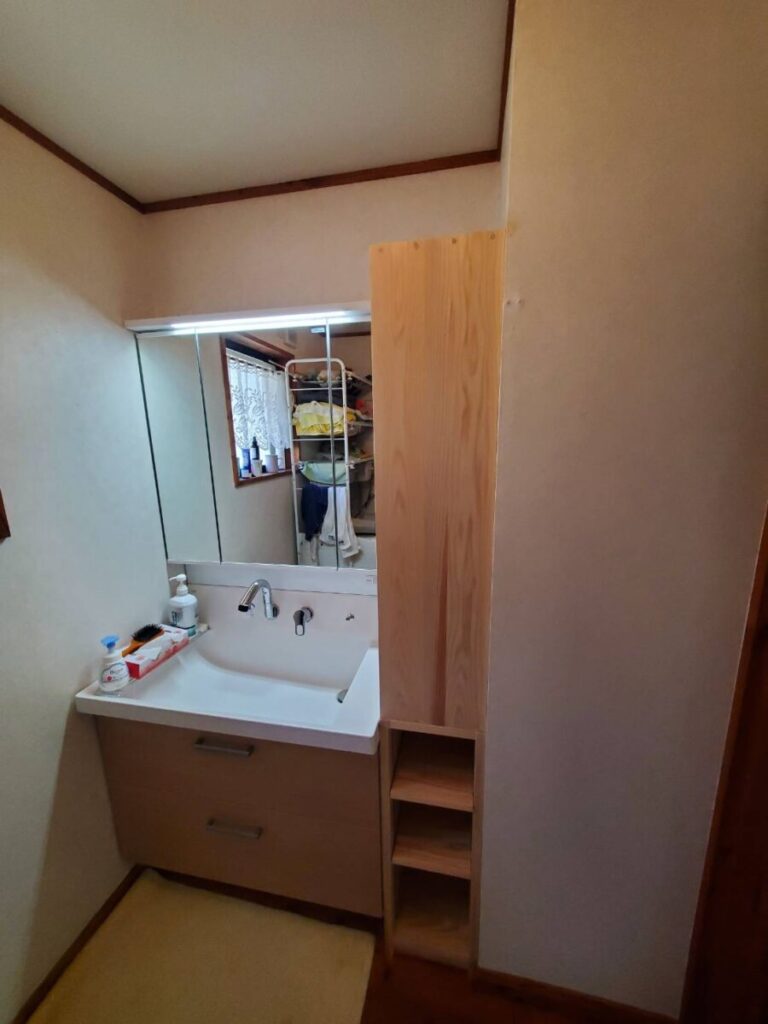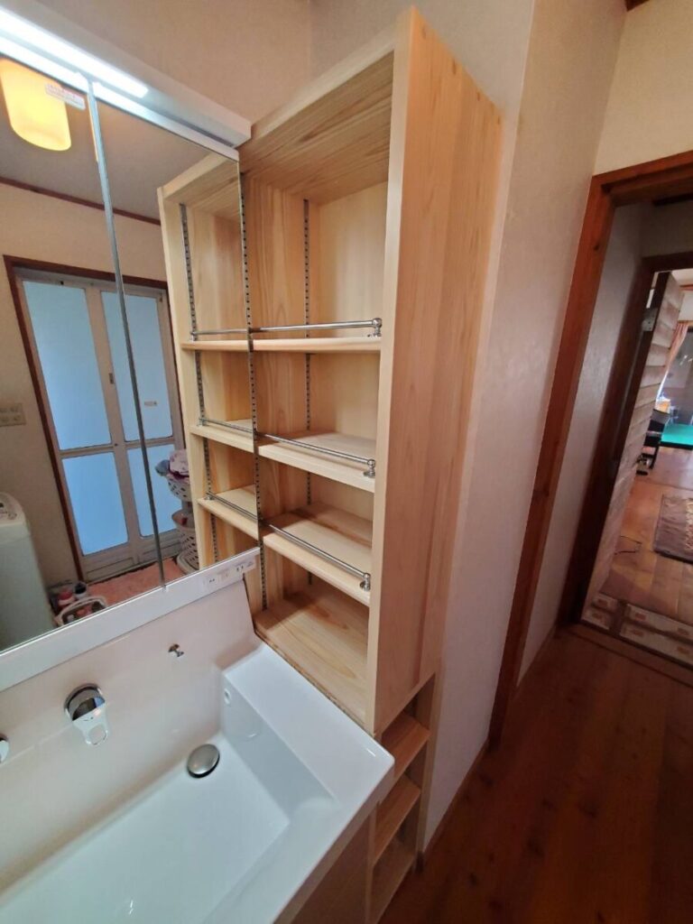 洗面台のサイズ変更で生まれたスペースには、タオルや日用品を収納できる造り付けの棚を設置。