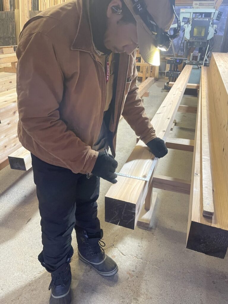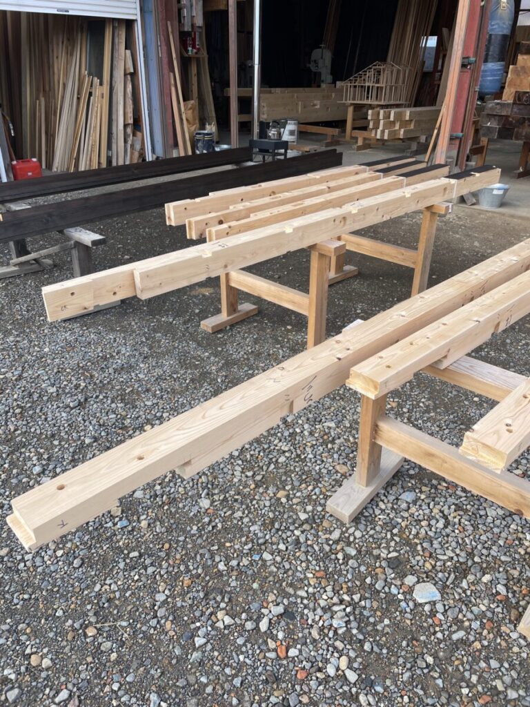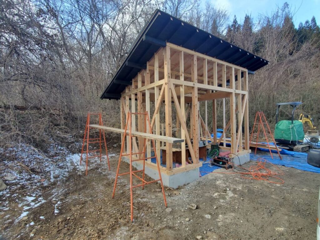 上田市 物置新築工事②墨付け刻み・建て方 2026.02.21 新築・注文住宅 作業場にて材木の墨付け、刻み作業の様子です。一本一本、寸法を確認しながら丁寧に加工しています。 材料の状態を見極めながら加工し、強度と耐久性を確保していきます。 基礎を終えた現場では、いよいよ建て方を行いました。 柱や梁が組み上がると、一気に建物の形が見えてきます。小さな物置でも、構造はしっかりと。 丈夫で長く使える物置になるよう、最後まで責任をもって施工いたします。 完成までもう少し。引き続き丁寧に仕上げていきます。 伝統工法手刻み物置工務店木造物置3坪物置手づくり物置木のある暮らし上田市自由設計丸屋建設工業株式会社小規模建築大工